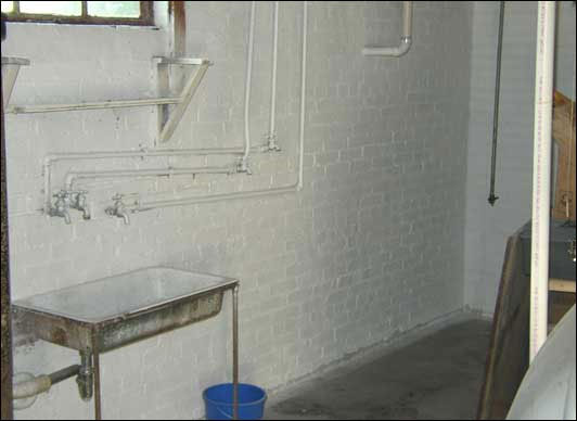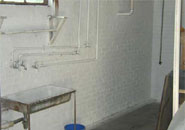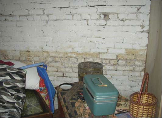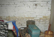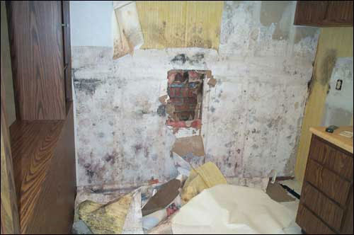 [1] View of basement in residence before mold remediation: water stained and moldy brick foundation wall.